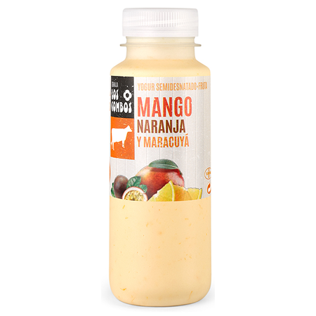 Yogur líquido tropical de mango, maracuyá y naranja.